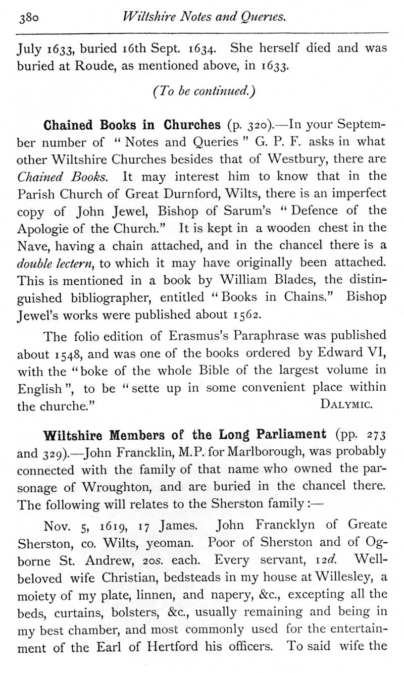 Page 43 Trustees of Earl of Pembroke in 1666. Chained book in Great Durnford church. Wiltshire members of the Long Parliament: John Francklin, Marlborough.