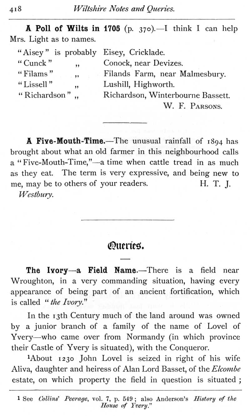 Page 33 A Wiltshire poll-book of 1705. A five-mouth-time (dialect term). The Ivory, a Wroughton field name.
