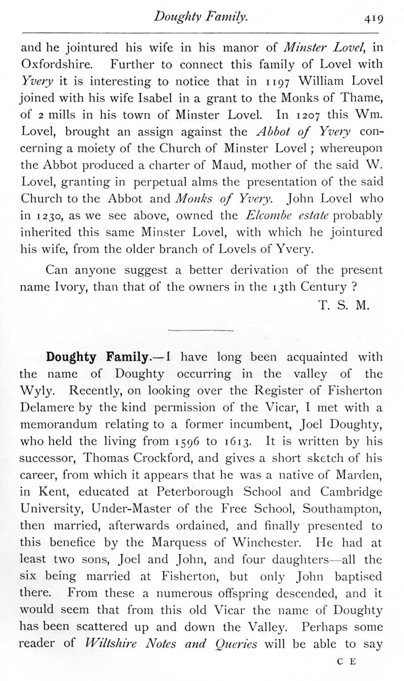 Page 34 The Ivory, a Wroughton field name. Doughty family of Fisherton Delamere.