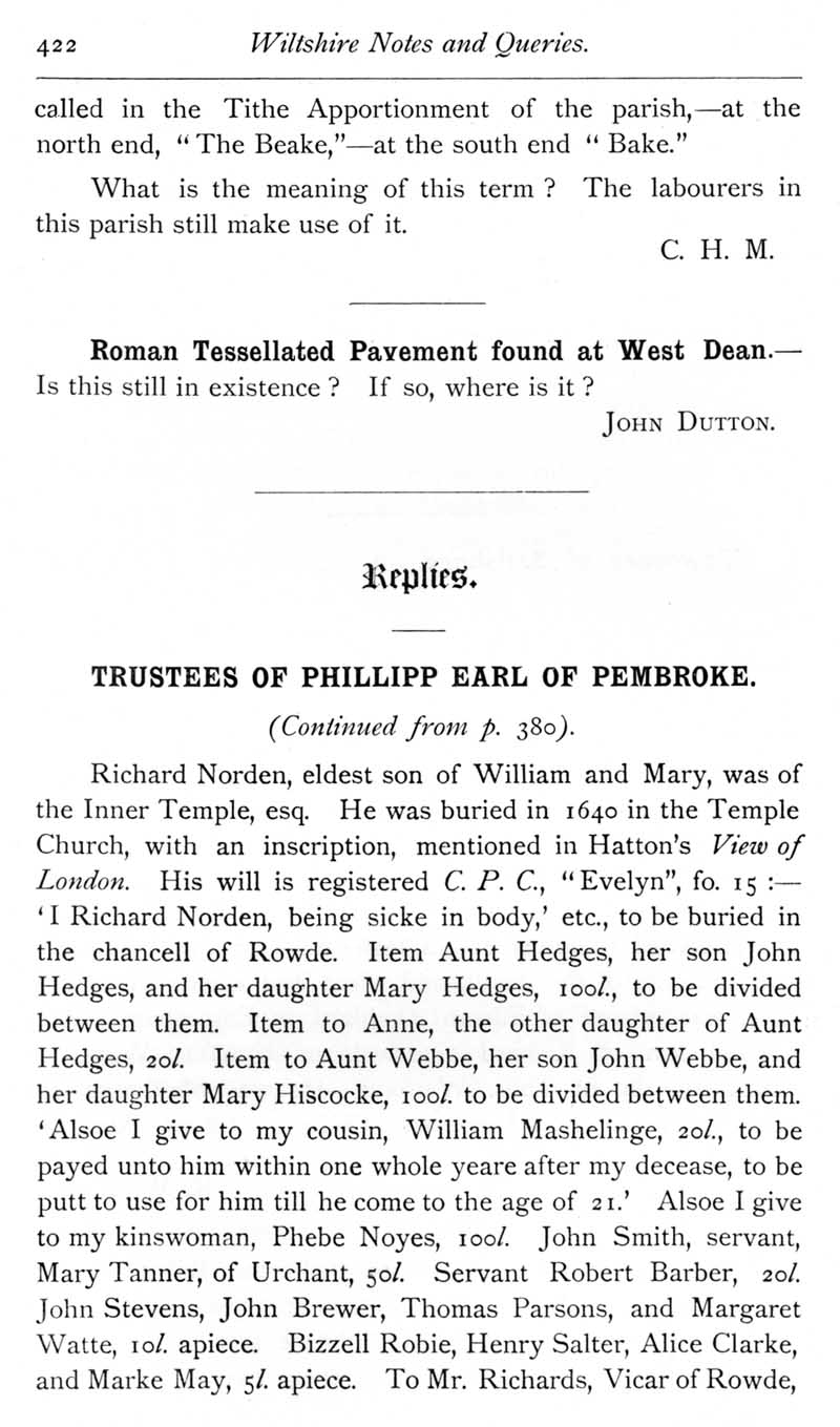 Page 37 Land called The Beake in Fisherton Delamere. Roman tessellated pavement at West Dean. Trustees of Earl of Pembroke in 1666.