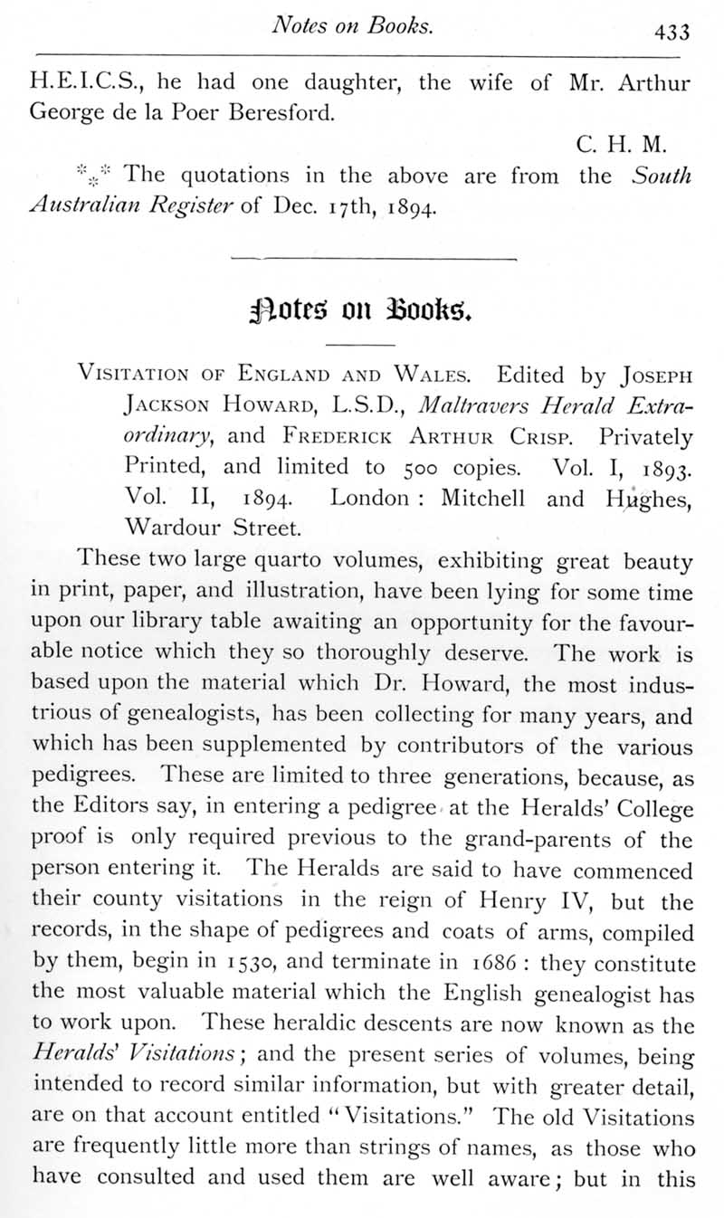 Page 48 Obituary notice of George Mayo, F.R.C.S., of Adelaide, a pioneer settler, born at Seend. Review of 'Visitation of England and Wales', by Crisp and Howard.