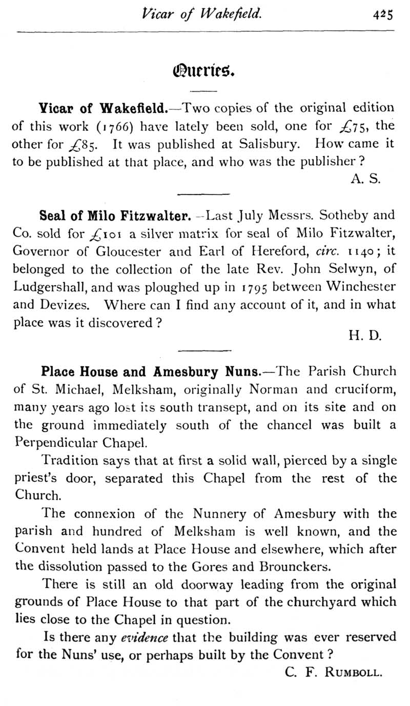 Chapter 10 Isaac Walton; Records of Wiltshire Parishes; Feet of Fines for Wiltshire; Quakerism in Wiltshire; Corr of Aldbourne; De Chyrebury of Seend; Houlton-Selfe; The Form 'Sarum'; John Noyes of Calne; Queries; Replies; Notes on Books