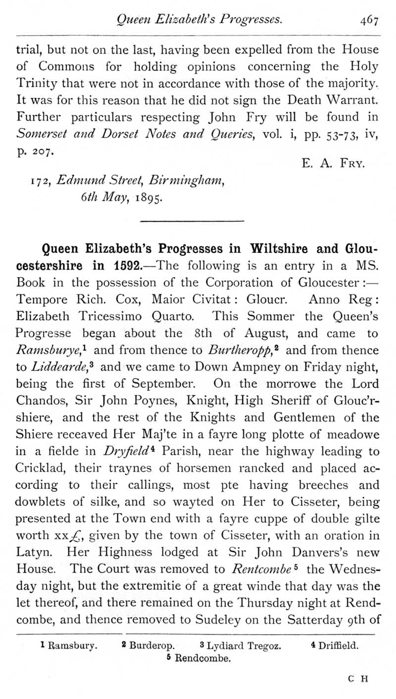 Page 34 William Fry of Ashgrove in Donhead St Mary, born 1622. Queen Elizabeth's progresses in Wiltshire and Gloucestershire in 1592.