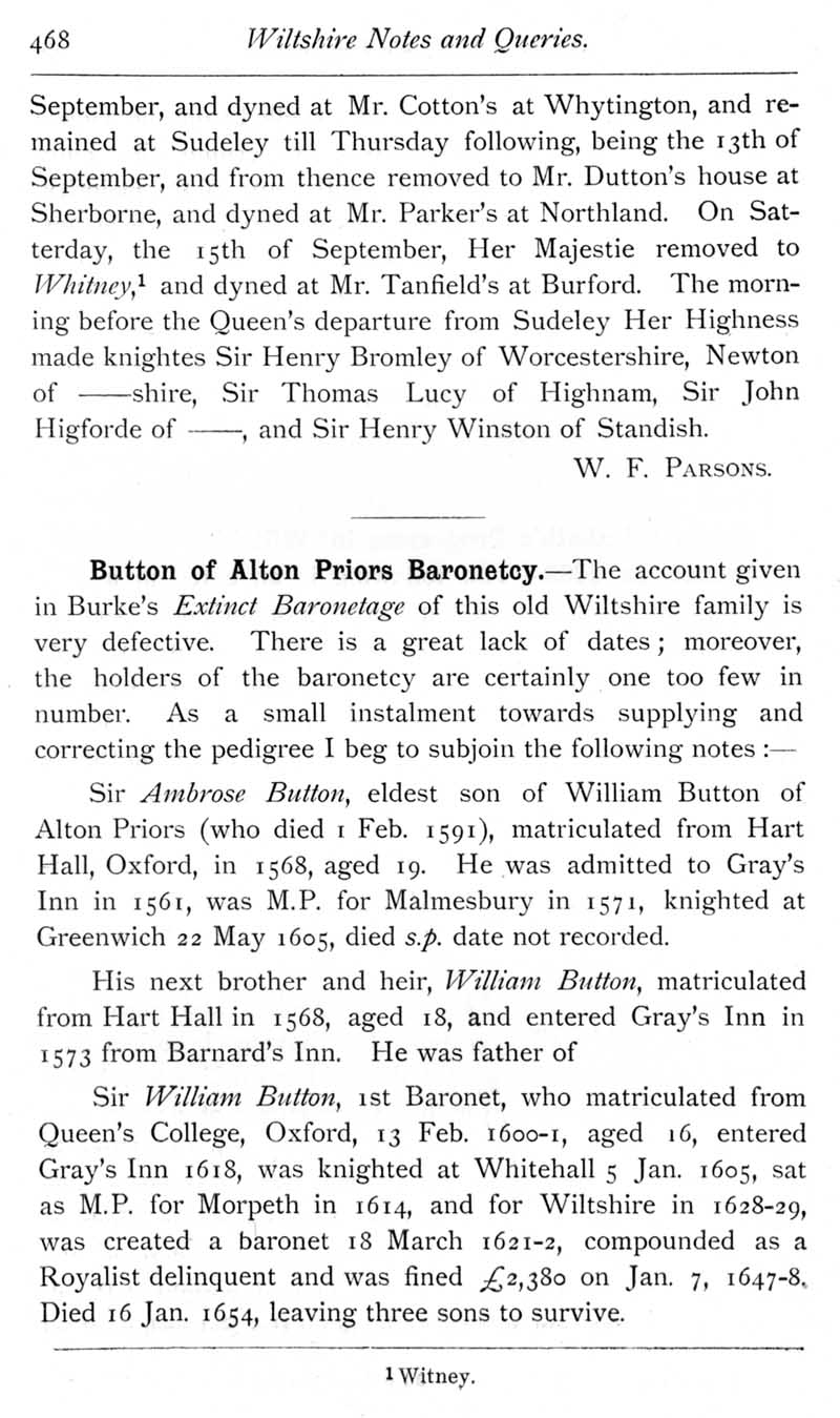 Page 35 Queen Elizabeth's progresses in Wiltshire and Gloucestershire in 1592. Button family of Alton Priors.