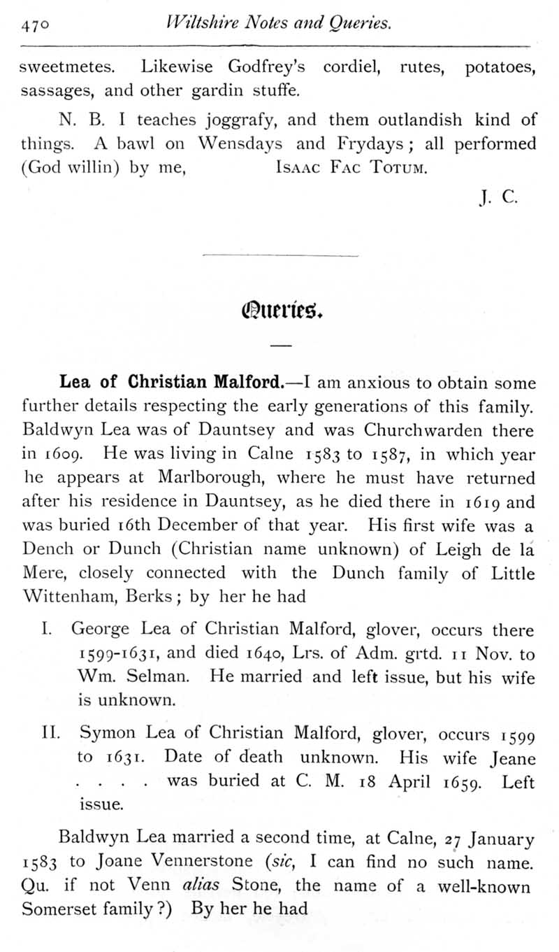 Page 37 Advertisement of Isaac Factotum, supposedly a Wiltshire village schoolmaster, etc., in 1786. Lea family of Christian Malford.