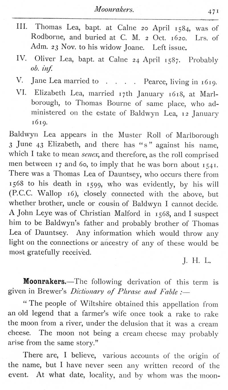 Page 38 Lea family of Christian Malford. Derivation of the term 'moonrakers'.