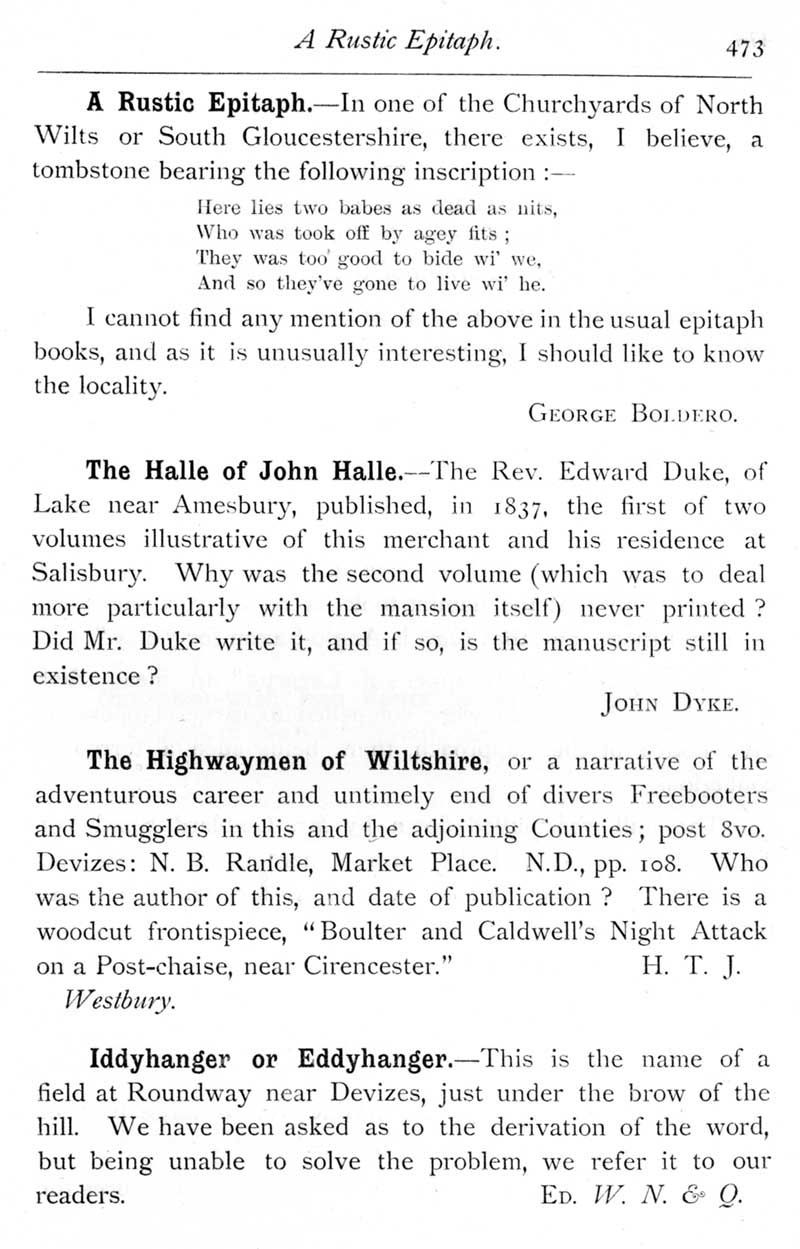 Page 40 Supposed epitaph in a north Wiltshire or south Gloucestershire churchyard. Book by Rev. Edward Duke on The Halle of John Halle. Book on Wiltshire highwaymen. Derivation of Iddyhanger field name at Roundway near Devizes.