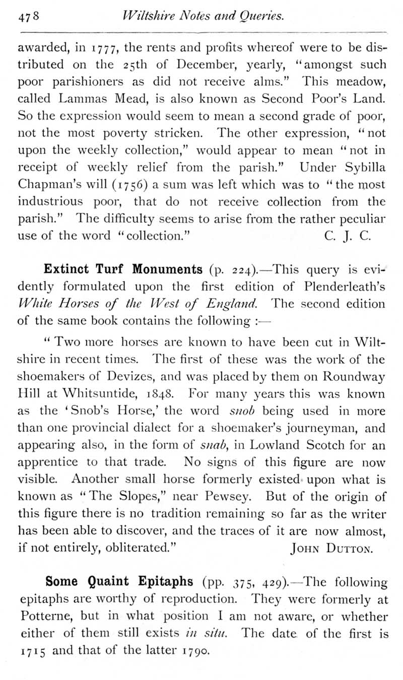 Page 45 Meaning of the expression 'the second poor'. Former Wiltshire White Horses, near Devizes and Pewsey. Epitaphs at Potterne.