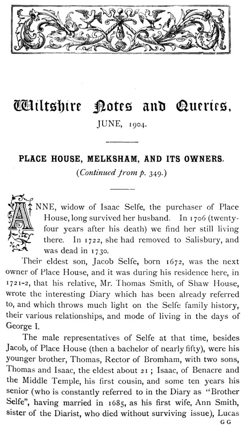 Chapter 11 Place House, Melksham; Records of Wiltshire Parishes; Quakerism in Wiltshire; Feet of Fines for Wiltshire; Wig Curlers; Sale of the Townshend Heirlooms; John Noyes of Calne; Brass of Edith Matyn; Queries; Replies; Notes on Books