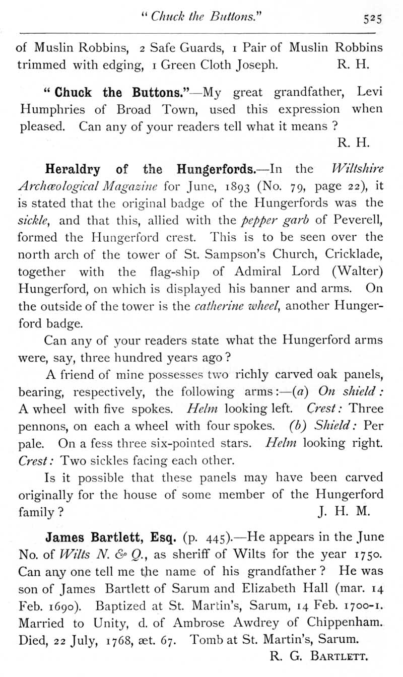 Page 46 Terms mentioned in a probate inventory. Use of expression 'chuck the buttons'. Heraldry of the Hungerfords. Ancestry of James Bartlett, sheriff in 1750.