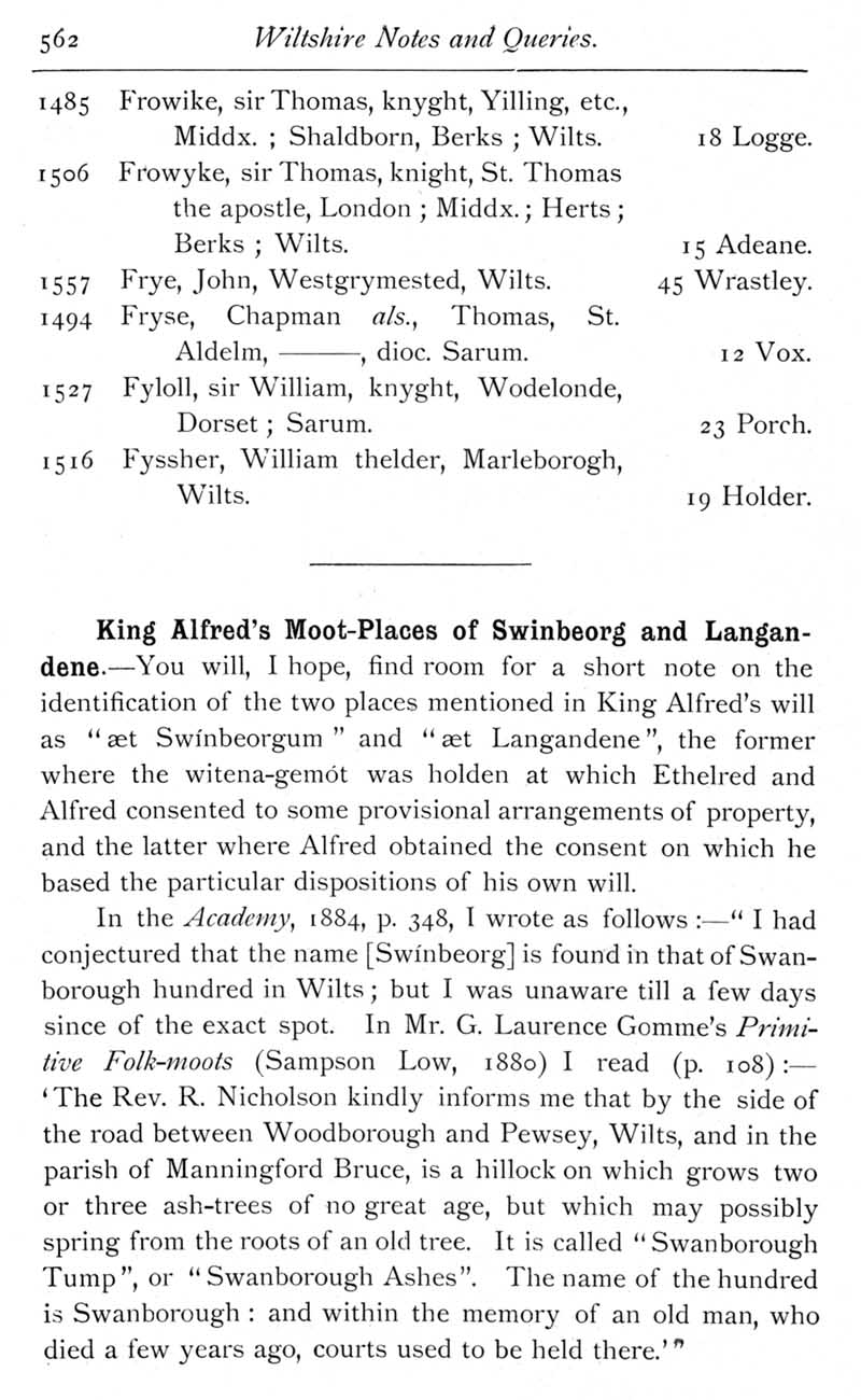 Page 33 Wiltshire wills proved in the Prerogative Court of Canterbury, 1383-1558 - Frowke to Fyssher. King Alfred's moot-places of Swinbeorg and Langandene.