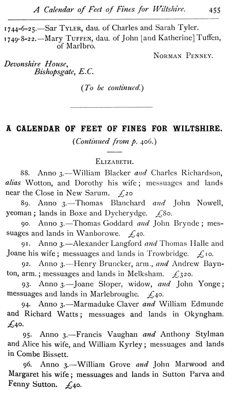 Chapter 11 Place House, Melksham; Records of Wiltshire Parishes; Quakerism in Wiltshire; Feet of Fines for Wiltshire; Wig Curlers; Sale of the Townshend Heirlooms; John Noyes of Calne; Brass of Edith Matyn; Queries; Replies; Notes on Books