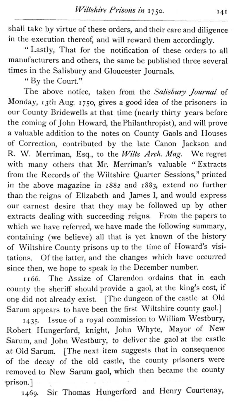 Page 44 Wiltshire prisons in 1750, Marlborough, Devizes, Salisbury and Fisherton.
