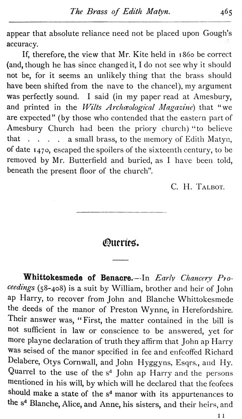 Chapter 11 Place House, Melksham; Records of Wiltshire Parishes; Quakerism in Wiltshire; Feet of Fines for Wiltshire; Wig Curlers; Sale of the Townshend Heirlooms; John Noyes of Calne; Brass of Edith Matyn; Queries; Replies; Notes on Books