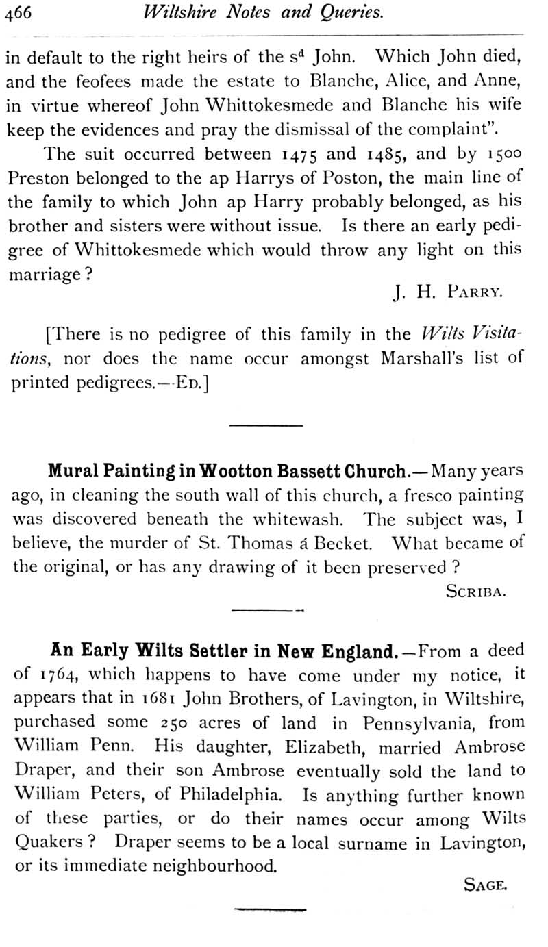 Chapter 11 Place House, Melksham; Records of Wiltshire Parishes; Quakerism in Wiltshire; Feet of Fines for Wiltshire; Wig Curlers; Sale of the Townshend Heirlooms; John Noyes of Calne; Brass of Edith Matyn; Queries; Replies; Notes on Books