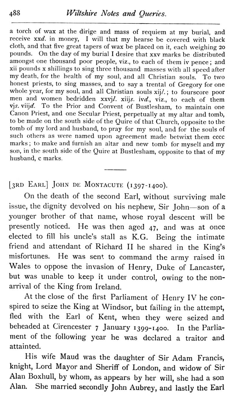 Chapter 12 Montacute, Earl of Salisbury; Records of Wiltshire Parishes; Quakerism in Wiltshire; Feet of Fines for Wiltshire; Sevenhampton; Eyre of Wilts; Eyre of Bromham; Monumental Inscriptions in Corsham Church; Blake; Miscellanea; The Polecat in Wiltshire; Queri